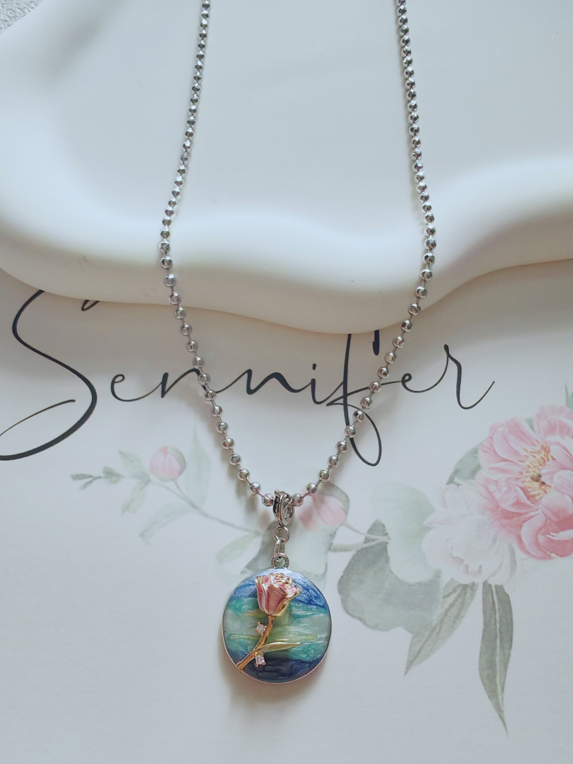Elevate your style with this enchanting Rose Pendant Necklace, featuring a round resin charm with a delicate 3D pink rose set against a dreamy, marbled blue and green background. The elegant silver ball chain adds a modern touch, making it perfect for both everyday wear and special occasions. This handcrafted piece captures the essence of nature and romance—an ideal gift for flower lovers, romantics, and art jewelry collectors.
