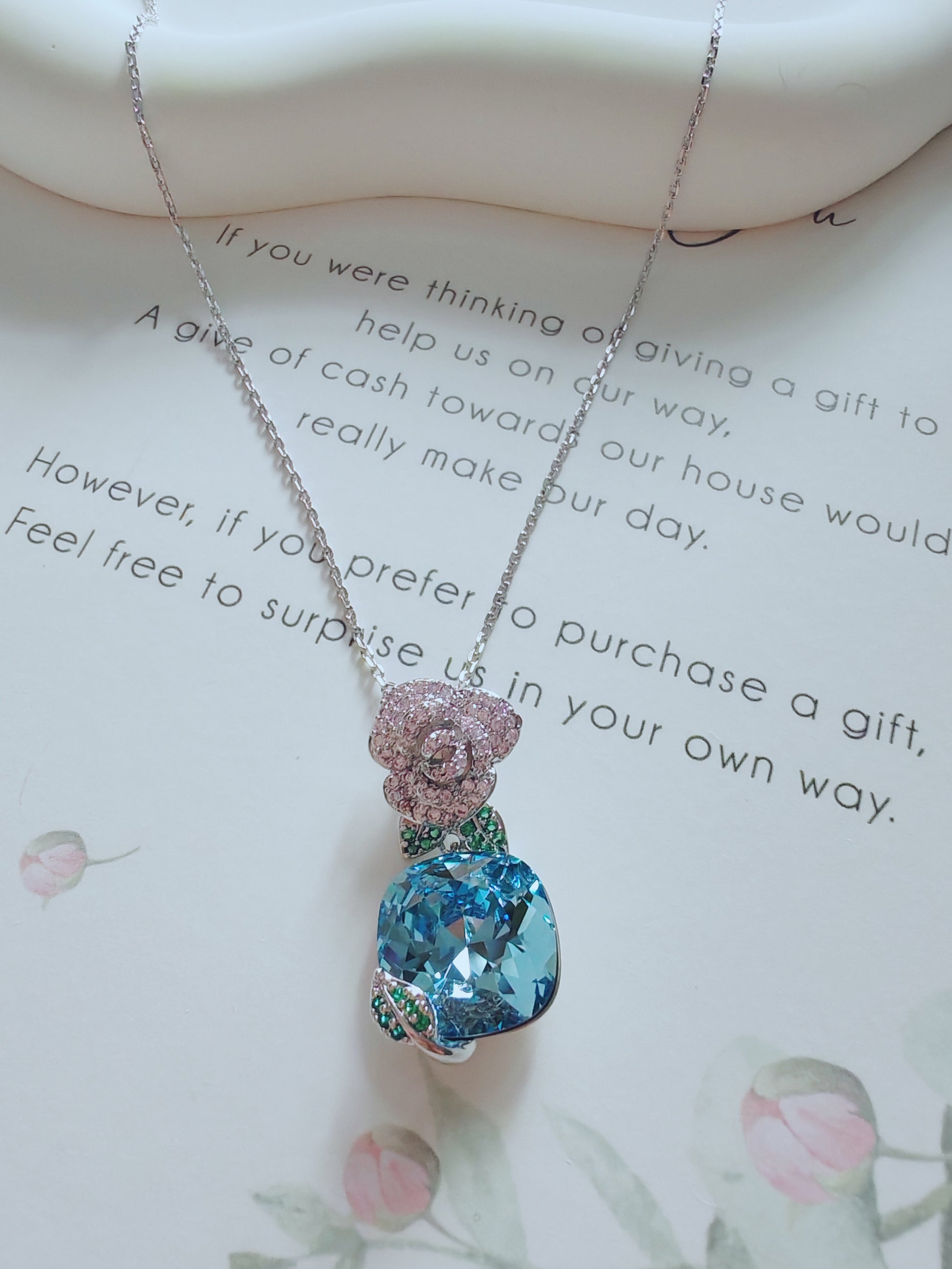 Add a touch of luxury to your jewelry collection with this stunning Blue Crystal Flower Pendant Necklace. Featuring a large, cushion-cut aqua blue crystal, this necklace radiates brilliance from every angle. Above the centerpiece, a delicate pink crystal-encrusted rose with green gem leaves adds a romantic and feminine flair.